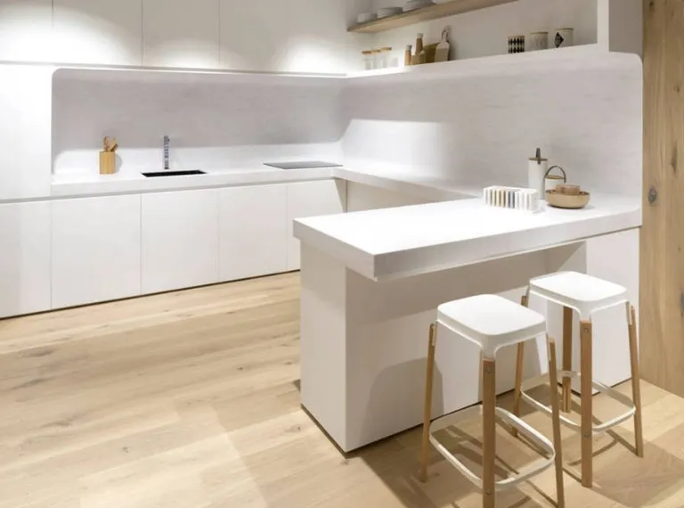 The most common option when it comes to kitchen design is to finish the edge of the worktop to the same thickness as the slabs themselves. In the case of Krion, however, it is possible to choose between different finishes , in order to increase the degree of functionality and also obtain more interesting results in terms of image.